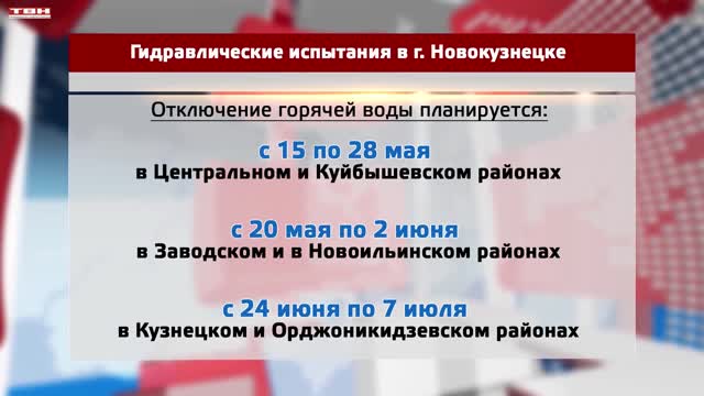 Также с 20-го мая по 2-ое июня не будет горячей воды в Заводском и Новоильинском районах. И завершает этапы гидравлических испытаний в Новокузнецке с 24 июня по 7 июля в Кузнецком и Орджоникидзевском районах.